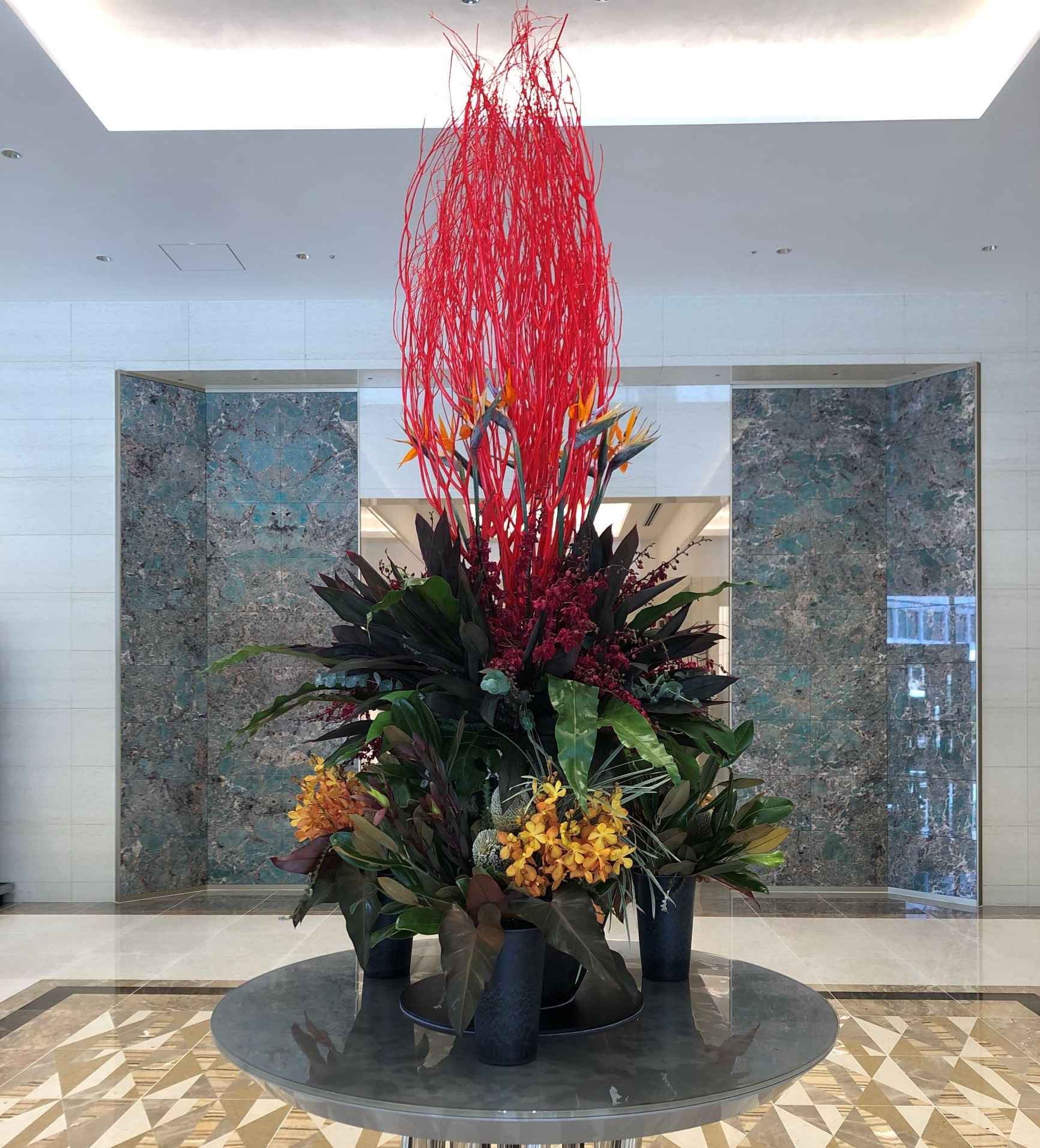 今月のロビー装花 2019.11.01 Individual (個性的) あえて人工的に わざとらしく鮮明な赤に塗られた枝を芯に立て そこへ個性的な形や色をした植物を集め インパクトある個性的なデザインにしております。