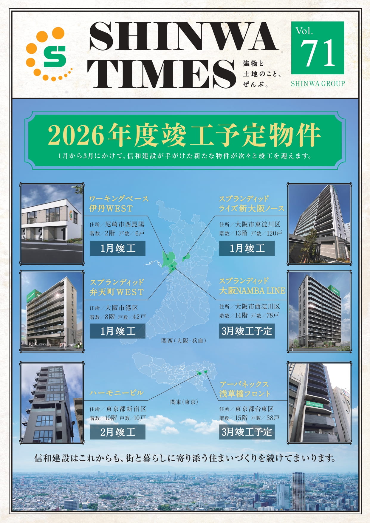 信和建設では、地域ごとの特性やニーズに応じた企画・設計を行い、都市の発展と暮らしの質の向上に貢献する住まいづくりを進めております。本号では、その取り組みの一端として、今後竣工を迎える物件を一覧でご紹介しております。