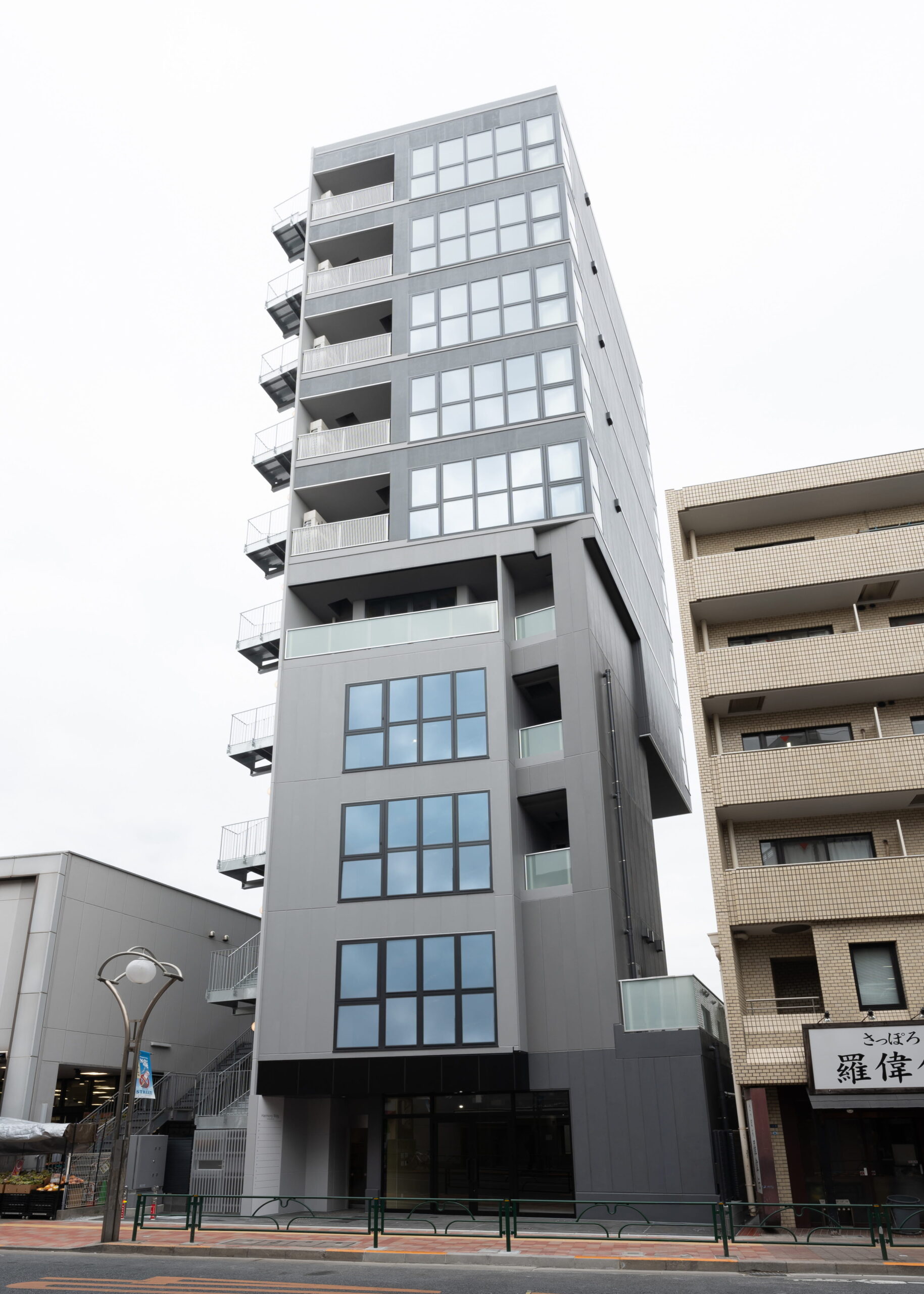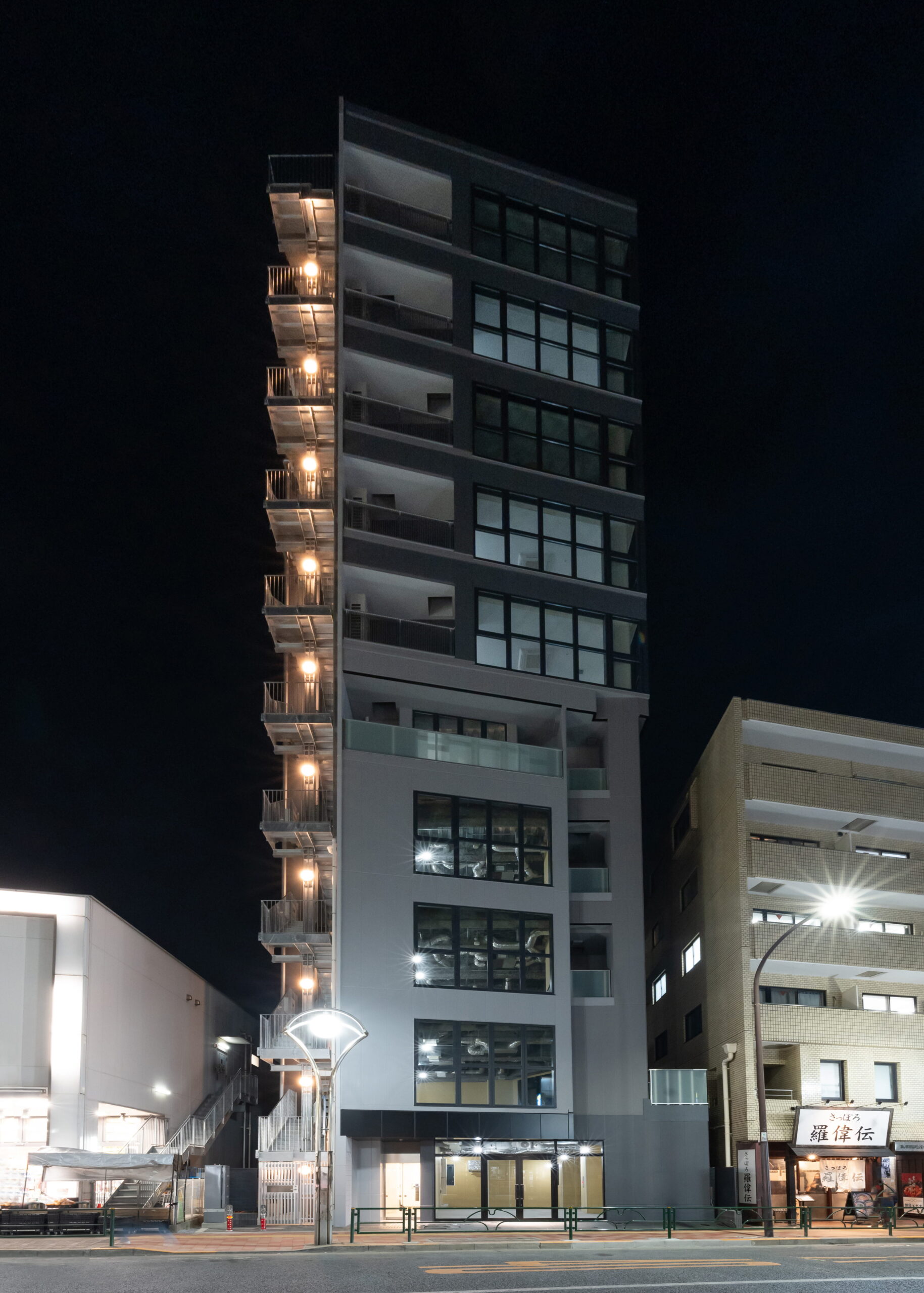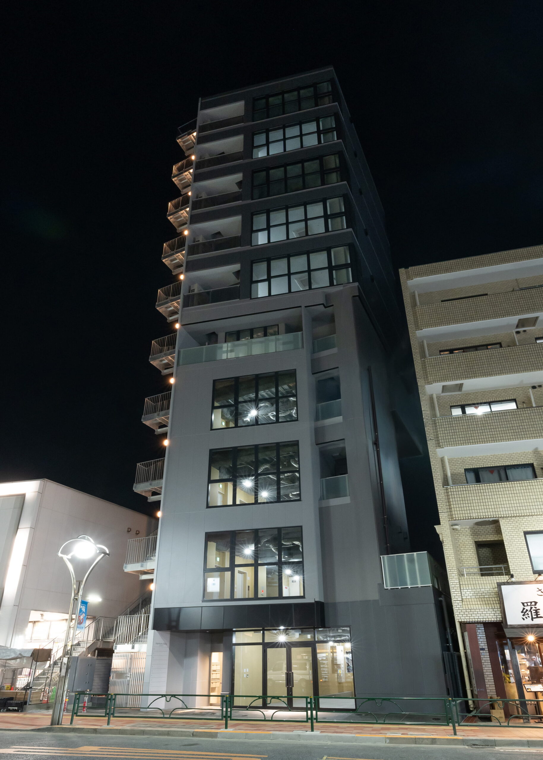 駅近立地での建設では、敷地条件や近隣環境への配慮、工程管理など高度な施工マネジメントが求められます。本プロジェクトにおいても、都市部ならではの制約条件に対応しながら、安全・品質・工程を徹底管理し、計画通りの竣工を実現しました。外観デザインは都市景観との調和を意識しつつ、テナントビルとしての存在感も兼ね備えたファサードとしています。