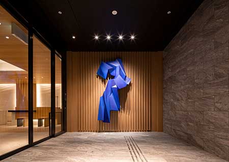 インテリアのコンセプトは「Unleash the mind (心を解き放つ)」。温かみのある白、彩度を抑えた木材、ブランドカラーのブルーを中心に構成された室内がゲストをやさしく包み込み、心地よい時間が流れます。水の都である大阪の川の流れをイメージし、江戸時代に難波で栽培されていたとされる難波水藍のカラーの青をふんだんに内装に取り入れやすらぎある空間を演出しました。