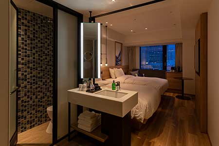 白を基調とした清潔感あふれる客室は全300室。ユニバーサルルーム(27平米)1室を除く299室が21平米です。インバウンド客を意識して、バスタブは備えず、シャワーブースのみを設置しました。洗面台とベッドの間の間仕切りを可動式とすることで、部屋全体を広く使えるよう工夫しました。