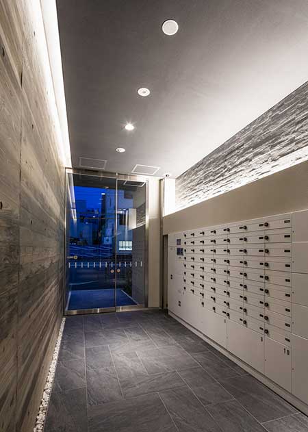 エントランスホールにはダウンライトをポイントのみに配置し、間接照明で柔らかな光を演出し、お住まいの方にとって、洗練さと落ち着きと安堵感を感じさせる迎賓空間に仕立て上げています。