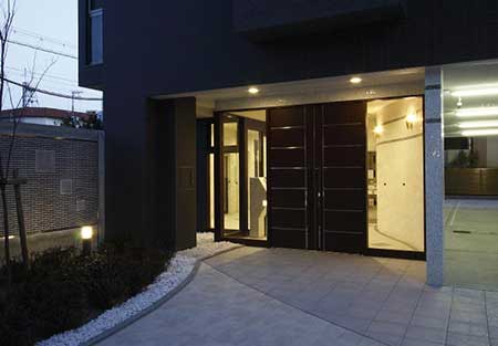 一つの敷地にワンルーム賃貸マンションを3連棟で建築した当社開発物件です。 阪急京都線の車内から見えるこちらの物件は、白と黒のツートンカラーでとても印象に残ります。 入居者の方が帰ってきたくなるようなマンションとするよう、エントランスにもこだわって作っています。