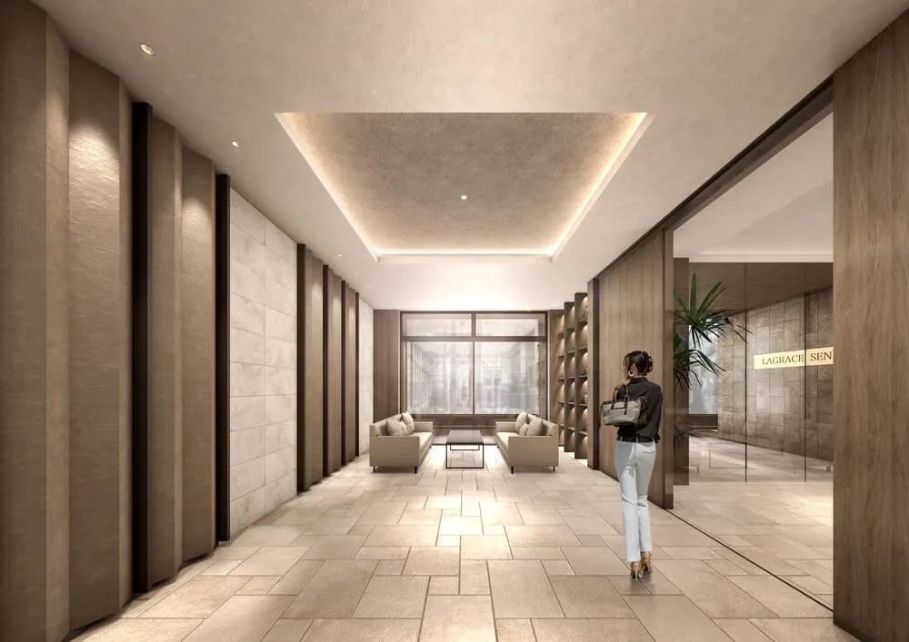 外観は、グレーの外壁タイルと、正面に位置する2色に建て分けられたベランダのすりガラスによって明と暗のコントラストがシャープで都会的な印象を与え、高級感と洗練された雰囲気を際立たせます。